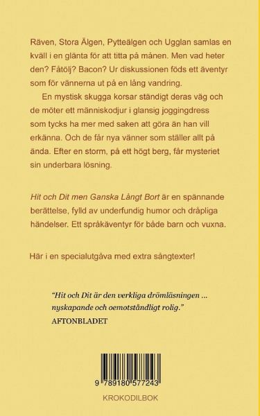 "Hit och Dit är den verkliga drömläsningen, nyskapande och oemotståndligt rolig." AFTONBLADET "Det här är ren språkglädje, underfundig humor och en fröjd att läsa." BIBLIOTEKSTJÄNST Räven, Stora Älgen, Pytteälgen och Ugglan samlas en kväll i en glänta för att titta på månen. Men vad heter den? Fåtölj? Bacon? Ur diskussionen föds ett äventyr som för vännerna ut på en lång vandring. En mystisk skugga korsar ständigt deras väg och de möter ett människodjur i glansig joggingdress som tycks ha mer med saken att göra än han vill erkänna. Och de får nya vänner som ställer allt på ända. Efter en storm, på ett högt berg, får mysteriet sin underbara lösning. Hit och Dit men Ganska Långt Bort är en spännande berättelse, fylld av underfundig humor och dråpliga händelser. Ett språkäventyr för både barn och vuxna. Här i en nyutgåva med extra sångtexter!