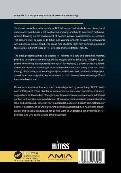 This book presents a wide variety of HIT failures so that students can dissect and understand in each case what went wrong and why and how to avoid such problems, without focusing on the involvement of specific people, organizations, or vendors. The lessons may be applied to future and existing projects, or used to understand why a previous project failed. The cases help students learn how common causes of failure affect different kinds of HIT projects and with different results. The book presents a model to discuss HIT failures in a safe and protected manner, providing an opportunity to focus on the lessons offered by a failed initiative as opposed to worrying about potential retribution for exposing a project as having failed. Cases are organized by the type of focus (hospital care, ambulatory care, and community). Each case provides analysis by an author who was involved in the project expert insight into key obstacles that must be overcome to leverage IT and transform healthcare. Cases include a list of key words and are categorized by project (e.g. CPOE, business intelligence). Each chapter or case contains discussion questions and study suggestions for the student. Thought provoking commentary chapters add additional context to the challenges faced during HIT projects, from social and organizational to legal and contractual. Whether you're a graduate student in a health administration or health IT program or attending training sessions sponsored by a healthcare organization, this valuable resource is for all who want to understand the dynamics of HIT projects and why some fail and others succeed.