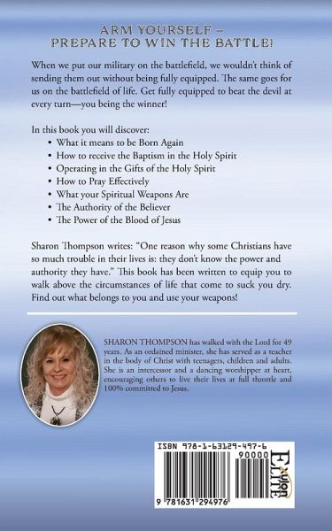 ARM YOURSELF --PREPARE TO WIN THE BATTLE! When we put our military on the battlefield, we wouldn't think of sending them out without being fully equipped. The same goes for us on the battlefield of life. Get fully equipped to beat the devil at every turn--you being the winner! In this book you will discover: What it means to be Born Again, How to receive the Baptism in the Holy Spirit, Operating in the Gifts of the Holy Spirit, How to Pray Effectively, What your Spiritual Weapons Are, The Authority of the Believer, The Power of the Blood of Jesus! Sharon Thompson writes: "One reason why some Christians have so much trouble in their lives is: they don't know the power andauthority they have." This book has been written to equip you to walk above the circumstances of life that come to suck you dry. Find out what belongs to you and use your weapons! SHARON THOMPSON has walked with the Lord for 49 years. As an ordained minister, she has served as a teacher in the body of Christ with teenagers, children and adults. She is an intercessor and a dancing worshipper at heart, encouraging others to live their lives at full throttle and 100% committed to Jesus.