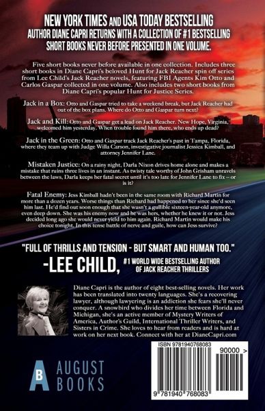 New York Times and USA Today Bestselling Author Diane Capri returns with a collection of #1 Bestselling short books never before presented in one volume. "Full of thrills and tension - but smart and human too." Lee Child, #1 World Wide Bestselling Author of Jack Reacher Thrillers Five short books never before available in one collection. Includes three short books in Diane Capri's beloved Hunt for Jack Reacher spin off series from Lee Child's Jack Reacher novels, featuring FBI Agents Kim Otto and Carlos Gaspar collected in one volume. Also includes two short books from Diane Capri's popular Hunt for Justice Series. Jack in a Box: Otto and Gaspar tried to take a weekend break, but Jack Reacher had out of the box plans. Where do Otto and Gaspar turn next? Jack and Kill: Otto and Gaspar get a lead on Jack Reacher. New Hope, Virginia, welcomed him yesterday. When trouble found him there, who ends up dead? Jack in the Green: Otto and Gaspar track Jack Reacher's past in Tampa, Florida, where they team up with Judge Willa Carson, investigative journalist Jessica Kimball, and attorney Jennifer Lane. Mistaken Justice: On a rainy night, Darla Nixon drives home alone and makes a mistake that ruins three lives in an instant. As twisty tale worthy of John Grisham unravels between the laws, Darla keeps her fatal secret until it's too late for Jennifer Lane to fix -- or is it? Fatal Enemy: Jess Kimball hadn't been in the same room with Richard Martin for more than a dozen years. Worse things than Richard had happened to her since she'd seen him last. He'd find out soon enough that she wasn't a gullible sixteen-year-old anymore, even deep down. She was his enemy now and he was hers, whether he knew it or not. Jess decided long ago she would never yield to him again. Richard Martin would make his choice tonight. In this tense battle of nerve and guile, how can Jess survive? "Intricate and ingenious - make some coffee, because you'll read all night." Lee Child, #1 Worldwide Bestselling author of Jack Reacher thrillers