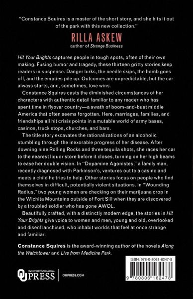 Hit Your Brights captures people in tough spots, often of their own making. Fusing humor and tragedy, these thirteen gritty stories keep readers in suspense. Danger lurks, the needle skips, the bomb goes off, and the empties pile up. Outcomes are unpredictable, but the car always starts, and, sometimes, love wins. Constance Squires casts the diminished circumstances of her characters with authentic detail familiar to any reader who has spent time in flyover country—a swath of boom-and-bust middle America that often seems forgotten. Here, marriages, families, and friendships all hit crisis points in a mutable world of army bases, casinos, truck stops, churches, and bars. Hit Your Brights showcases a virtuosic range of styles and perspectives. The title story, told in second person, excavates the rationalizations of an alcoholic stumbling through the inexorable progress of her disease. After downing nine Rolling Rocks and three tequila shots, she races her car to the nearest liquor store before it closes, turning on her high beams to ease her double vision. In "Dopamine Agonistes," a family man, recently diagnosed with Parkinson’s, ventures out to a casino and meets a child he tries to help. Other stories focus on people who find themselves in difficult, potentially violent situations. In "Wounding Radius," two young women are checking on their marijuana crop in the Wichita Mountains outside of Fort Sill when they are discovered by a troubled soldier who has gone AWOL. And in "An Unscheduled Stop," a mother traveling with her baby encounters diners at a roadside McDonald’s who might—or might not—be child traffickers. Beautifully crafted, with a distinctly modern edge, the stories in Hit Your Brights give voice to women and men, young and old, overlooked and disenfranchised, who inhabit worlds that feel at once strange and familiar.