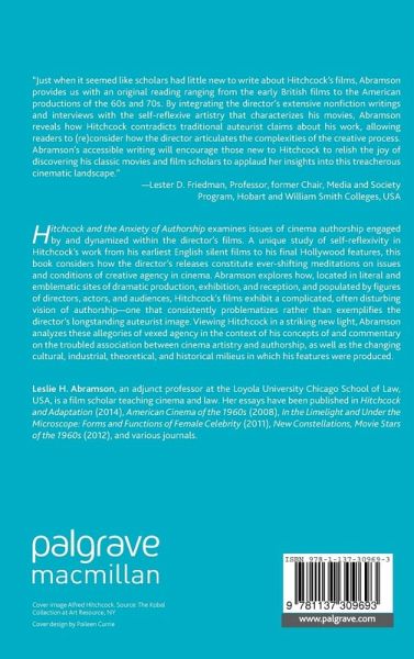 "Just when it seemed like scholars had little new to write about Hitchcock's films, Abramson provides us with an original reading ranging from the early British films to the American productions of the 60s and 70s. By integrating the director's extensive nonfiction writings and interviews with the self-reflexive artistry that characterizes his movies, Abramson reveals how Hitchcock contradicts traditional auteurist claims about his work, allowing readers to (re)consider how the director articulates the complexities of the creative process. Abramson's accessible writing will encourage those new to Hitchcock to relish the joy of discovering his classic movies and film scholars to applaud her insights into this treacherous cinematic landscape." - Lester D. Friedman, Professor, former Chair, Media and Society Program, Hobart College, USA and William Smith College, USA