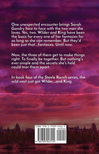 One unexpected encounter brings Sarah Gandry face to face with the two men she loves. Yes, two. Wilder and King have been the basis for every one of her fantasies for as long as she can remember. But they'd been just that...fantasies. Until now. Now, the three of them get to make things right. To finally be together. But nothing's ever simple and the secrets she's held could tear them apart. In book four of the Steele Ranch series, the wild west just got Wilder...and King.