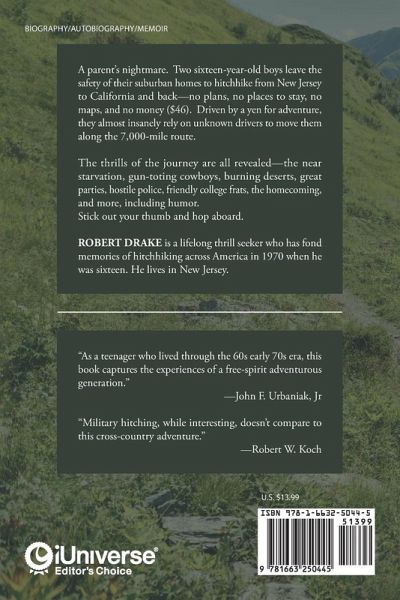 HITCHHIKING ADVENTURES-This modern-day Huck Finn-like adventure-only true-tells about two 16-year-old boys who run into unexpected circumstances while hitchhiking coast-to-coast. The boys find fun and freedom while covering over 7,000 miles of America, including stories of near-death and other incredible eye-opening experiences sprinkled with humor. Challenged with little money, they solely depended on the generosity and compassion of others to provide rides and sometimes more.