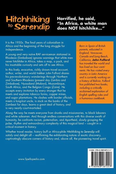 It is the 1950s. The final years of colonialism in Africa and the beginning of the long struggle for independence. A young and very naïve RAF serviceman stationed in Rhodesia (Simbabwe) ignores warnings that white men never hitchhike in Africa, takes a map, a pack, and his insatiable curiosity and sets off to see Africa. In this lively, evocative, richly drawn travel account, author, writer, and world trekker John Fulford shares his pre-revolutionary wanderings through Northern and Southern Rhodesia (present day Zambia and Zimbabwe), Nyasaland (Malawi), Mozambique, South Africa, and the Belgian Congo (Zaire). He accepts every invitation by every stranger that he meets and explores tobacco farms, copper mines, and sugar plantations. He clashes with border officials, meets a long-lost uncle, is stuck on the banks of the Zambezi for days, learns a great deal of history, and is very nearly court-martialed. Along the way he meets everyone from drunks and missionaries, to black laborers and white salesmen. And through endless conversations with this diverse swath of humanity, he confronts racism, paternalism, and Apartheid, slowly grasping the pulse, rhythm and extraordinary complexity of this magical land --- caught in a critical moment in history. Whether travel reader, history buff or Africa-phile Hitchhiking to Serendip will satisfy and delight all --- reaffirming the exhilarating nature of exotic discovery, captivatingly obscure corners of history and, above all, the pioneering travel spirit.