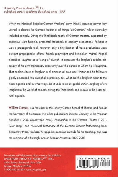When the National Socialist German Workers' party (Nazis) assumed power they vowed to cleanse the German theater of all things "un-German," which ostensibly included comedy. During the Third Reich nearly all German theaters, supported by enormous state funding, presented thousands of comedy productions. Perhaps it was a propaganda tool, however only a tiny fraction of these productions were outright propagandist efforts. French playwright and filmmaker, Marcel Pagnol described laughter as a "song of triumph...[that] expresses the laugher's sudden discovery of his own momentary superiority over the person at whom he is laughing. That explains burst of laughter in all times in all countries." Hitler and his followers gladly embraced this triumphal expression. Yet, what did this laughter mean to the Nazi agenda and in what ways did it undermine its goals? Hitler Laughing offers insight into the world of comedy during the Third Reich and its role in the Nazi cultural agenda.