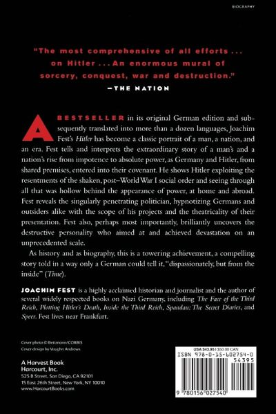 A bestseller in its original German edition and subsequently translated into more than a dozen languages, Joachim Fest's Hitler as become a classic portrait of a man, a nation, and an era. Fest tells and interprets the extraordinary story of a man's and a nation's rise from impotence to absolute power, as Germany and Hitler, from shared premises, entered into their covenant. He shows Hitler exploiting the resentments of the shaken, post-World War I social order and seeing through all that was hollow behind the appearance of power, at home and abroad. Fest reveals the singularly penetrating politician, hypnotizing Germans and outsiders alike with the scope of his projects and the theatricality of their presentation. Fest also, perhaps most importantly, brilliantly uncovers the destructive personality who aimed at and achieved devastation on an unprecedented scale. As history and as biography, this is a towering achievement, a compelling story told in a way only a German could tell it, "dispassionately, but from the inside." (Time)