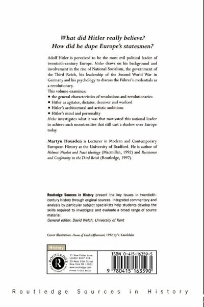 Adolf Hitler is perceived to be the most evil political leader of twentieth century Europe. Hitler draws on his background and involvement in the rise of National Socialism, the government of the Third Reich, leadership of the Second World War in Germany and his psychology to discuss Hitler's credentials as a revolutionary. This volume includes examination of: * the general characteristics of revolutions and revolutionaries * Hitler as Agitator, Dictator, Deceiver and Warlord * Hitler's architectural and artistic ambitions * Hitler's mind and personality. Hitler investigates what it was that motivated this national leader to achieve such monstrosities which still cast a shadow over Europe today.