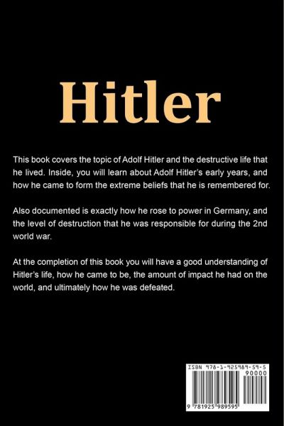 HITLER This book covers Adolf Hitler and the destructive life that he lived. Inside, you will learn about Adolf Hitler’s early years, and how he came to form the extreme beliefs that he is remembered for. Also documented is exactly how he rose to power in Germany, and the level of destruction that he was responsible for during the 2nd world war. At the completion of this book you will have a good understanding of Hitler’s life, how he came to be, the amount of impact he had on the world, and ultimately how he was defeated. Here Is What You'll Learn About... Hitler's Early Life How Hitler Became A Leader Beliefs & Political Views World War II Notable Moments In Hitler's Life The Death Of Hitler Much, Much More!