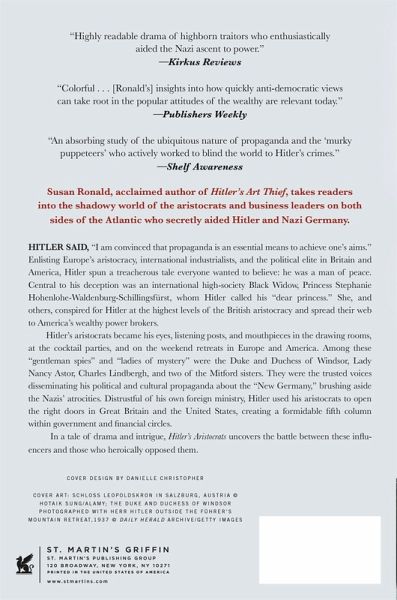 Susan Ronald, acclaimed author of Hitler's Art Thief, takes readers into the shadowy world of the aristocrats and business leaders on both sides of the Atlantic who secretly aided Hitler and Nazi Germany. Hitler said, "I am convinced that propaganda is an essential means to achieve one's aims." Enlisting Europe's aristocracy, international industrialists, and the political elite in Britain and America, Hitler spun a treacherous tale everyone wanted to believe: he was a man of peace. Central to his deception was an international high society Black Widow, Princess Stephanie Hohenlohe-Waldenburg-Schillingsfürst, whom Hitler called "his dear princess." She, and others, conspired for Hitler at the highest levels of the British aristocracy and spread their web to America's wealthy powerbrokers. Hitler's aristocrats became his eyes, listening posts, and mouthpieces in the drawing rooms, cocktail parties, and weekend retreats of Europe and America. Among these "gentlemen spies" and "ladies of mystery" were the Duke and Duchess of Windsor, Lady Nancy Astor, Charles Lindbergh, and two of the Mitford sisters. They were the trusted voices disseminating his political and cultural propaganda about the "New Germany," brushing aside the Nazis' atrocities. Distrustful of his own Foreign Ministry, Hitler used his aristocrats to open the right doors in Great Britain and the United States, creating a formidable fifth column within government and financial circles. In a tale of drama and intrigue, Hitler's Aristocrats uncovers the battle between these influencers and those who heroically opposed them.