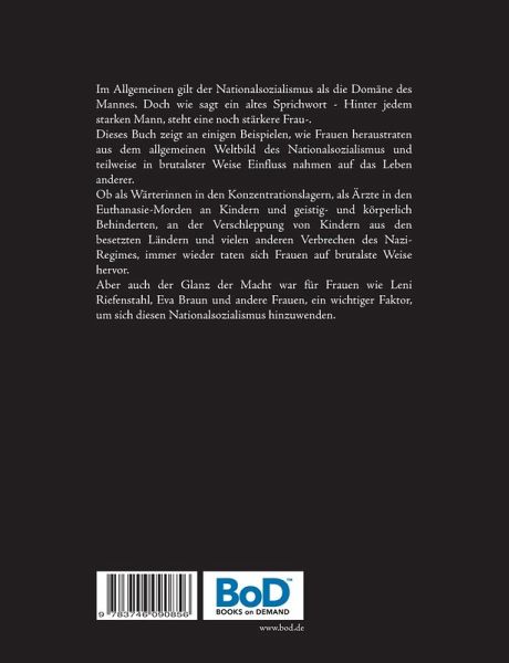 Im Allgemeinen gilt der Nationalsozialismus als die Domäne des Mannes. Doch wie sagt ein altes Sprichwort - Hinter jedem starken Mann, steht eine noch stärkere Frau-.Dieses Buch zeigt an einigen Beispielen, wie Frauen heraustraten aus dem allgemeinen Weltbild des Nationalsozialismus und teilweise in brutalster Weise Einfluss nahmen auf das Leben anderer.Ob als Wärterinnen in den Konzentrationslagern, als Ärzte in den Euthanasie-Morden an Kindern und geistig- und körperlich Behinderten, an der Verschleppung von Kindern aus den besetzten Ländern und vielen anderen Verbrechen des Nazi-Regimes, immer wieder taten sich Frauen auf brutalste Weise hervor.Aber auch der Glanz der Macht war für Frauen wie Leni Riefenstahl, Eva Braun und andere Frauen, ein wichtiger Faktor, um sich diesen Nationalsozialismus hinzuwenden.