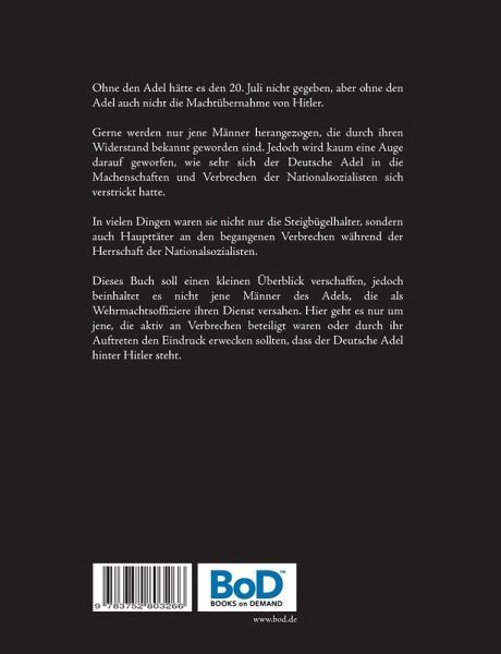 Ohne den Adel hätte es den 20. Juli nicht gegeben, aber ohne den Adel auch nicht die Machtübernahme von Hitler.Gerne werden nur jene Männer herangezogen, die durch ihren Widerstand bekannt geworden sind. Jedoch wird kaum eine Auge darauf geworfen, wie sehr sich der Deutsche Adel in die Machenschaften und Verbrechen der Nationalsozialisten verstrickt hatte.In vielen Dingen waren sie nicht nur die Steigbügelhalter, sondern auch Haupttäter an den begangenen Verbrechen während der Herrschaft der Nationalsozialisten.Dieses Buch soll einen kleinen Überblick verschaffen, jedoch beinhaltet es nicht jene Männer des Adels, die als Wehrmachtsoffiziere ihren Dienst versahen. Hier geht es nur um jene, die aktiv an Verbrechen beteiligt waren oder durch ihr Auftreten den Eindruck erwecken sollten, dass der Deutsche Adel hinter Hitler steht.