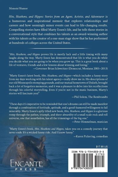 "A thoroughly absorbing and inherently fascinating account of a most unusual life lived out in a series of equally unusual circumstances."-Midwest Book Review Everyone has dreams of what they want to accomplish in life. Marty Essen's childhood dream of becoming a herpetologist gave way to his dream of becoming a popular DJ, which led to his dream of becoming a big-time talent manager, which morphed into the dream of becoming an in-demand author and college speaker. While he achieved most of his dreams at various levels, he also realized that he didn't necessarily have to reach the top to find success or happiness. Sometimes "almost" is close enough. Hits, Heathens, and Hippos: Stories from an Agent, Activist, and Adventurer is a humorous and inspirational memoir that explores relationships and careers and how seemingly minor events can lead to life-changing results. Compelling stories have filled Marty's life, and he tells those stories in a conversational style that combines his talents as an award-winning author with his talents as the creator of a one-man stage show that he has performed at hundreds of colleges across the United States. This is a must-read for anyone faced with an unexpected career change, worried about finding and keeping the partner of their dreams, forced to take on bullies (whether individual, political, or corporate), eager for ideas to make life more satisfying, or just in search of a fun-filled adventure. Marty's stories include: Growing up with an over-the-top, born-again Christian father, who prayed aloud in restaurants, thought Satan possessed his Masonic lodge watch, and attempted to faith-heal his old Toyota. Becoming the youngest disc jockey in Minnesota history, where he survived an on-air attack from a jealous DJ and learned that rock 'n' roll and country radio stations have vastly different groupies. Running multiple music talent agencies and becoming one of the top young talent managers in America. Telling the best lie ever to reel in and marry an amazing woman that the media would later dub as his "intrepid wife." Moving to Montana, where he founded one of the state's fastest growing independent telephone companies and an unusual baseball league with pro-prospects and out-of-control players. Surviving as an outspoken liberal in the most conservative region of Montana and dealing with the death threats and dirty tricks that came with it. Heartwarming and humorous stories from his relationships with musicians, governors, senators, and a very special Democratic nominee for President of the United States. Traveling to all seven continents in search of rare and interesting wildlife, backpacking with a tribe known for headhunting, and surviving a vicious hippo attack. Be inspired, intrigued, and entertained!