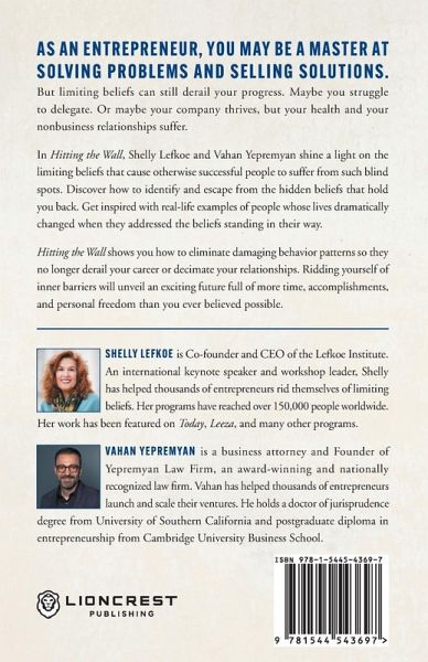 As an entrepreneur, you're a master at solving problems and selling solutions. But limiting beliefs can still derail your progress. You struggle to delegate. Your company thrives, but your health and your nonbusiness relationships suffer. In Hitting the Wall, Shelly Lefkoe and Vahan Yepremyan shine a light on the limiting beliefs that cause otherwise successful people to suffer from such blind spots. Discover how to identify and escape from the hidden beliefs that hold you back. Get inspired with real-life examples of people whose lives dramatically changed when they addressed the beliefs standing in their way. Hitting the Wall shows you how to eliminate damaging behavior patterns so they no longer derail your career or decimate your relationships. Ridding yourself of inner barriers will unveil an exciting future full of more time, accomplishments, and personal freedom than you ever believed possible.