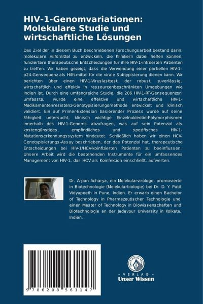 Das Ziel der in diesem Buch beschriebenen Forschungsarbeit bestand darin, molekulare Hilfsmittel zu entwickeln, die Klinikern dabei helfen können, fundiertere therapeutische Entscheidungen für ihre HIV-1-infizierten Patienten zu treffen. Wir haben gezeigt, dass die Verwendung einer partiellen HIV-1-p24-Gensequenz als Hilfsmittel für die virale Subtypisierung dienen kann. Wir berichten über einen HIV-1-Viruslasttest, der robust, zuverlässig, wirtschaftlich und effektiv in ressourcenbeschränkten Umgebungen wie Indien ist. Durch eine umfangreiche Studie, die 206 HIV-1-RT-Gensequenzen umfasste, wurde eine effektive und wirtschaftliche HIV-1-Medikamentenresistenz-Genotypisierungsmethode entwickelt und klinisch validiert. Ein auf Primer-Extension basierender Prozess wurde auf seine Fähigkeit untersucht, klinisch wichtige Einzelnukleotid-Polymorphismen innerhalb des HIV-1-Genoms abzufragen, was auf sein Potenzial als kostengünstiges, empfindliches und spezifisches HIV-1-Mutationserkennungssystem hindeutet. Schließlich haben wir einen HCV-Genotypisierungs-Assay beschrieben, der das Potenzial hat, therapeutische Entscheidungen bei HIV-1/HCV-koinfizierten Patienten zu beeinflussen. Unsere Arbeit wird die bestehenden Instrumente für ein umfassendes Management von HIV-1, das HCV als Koinfektion einschließt, aufwerten.