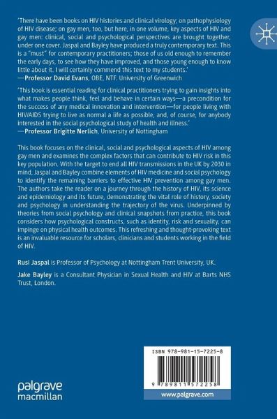 This book focuses on the clinical, social and psychological aspects of HIV among gay men and examines the complex factors that can contribute to HIV risk in this key population. With the target to end all HIV transmissions in the UK by 2030 in mind, Jaspal and Bayley combine elements of HIV medicine and social psychology to identify the remaining barriers to effective HIV prevention among gay men. The authors take the reader on a journey through the history of HIV, its science and epidemiology and its future, demonstrating the vital role of history, society and psychology in understanding the trajectory of the virus. Underpinned by theories from social psychology and clinical snapshots from practice, this book considers how psychological constructs, such as identity, risk and sexuality, can impinge on physical health outcomes. This refreshing and thought-provoking text is an invaluable resource for scholars, clinicians and students working in the field of HIV.