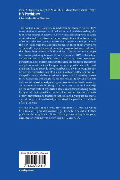 This book is a practical guide in understanding how to prevent HIV transmission, to recognize risk behaviors, and to add something else to their repertoires. It aims to empower clinicians and provide a sense of security and competence with the recognition and understanding of some of the psychiatric illnesses that complicate and perpetuate the HIV pandemic that continue to persist throughout every area of the world despite the magnitude of the progress that has transformed the illness from a rapidly fatal to chronic illness that is no longer life-limiting. Missing in most of the literature on HIV is the subtle, and sometimes not so subtle, contribution of psychiatric symptoms, psychiatric illness, and risk behaviors that drive the pandemic and serve as catalysts for new infections. This practical guide provides state-of-the-art understanding of not only prevention but also a way to recognize risk behaviors, psychiatric symptoms, and psychiatric illnesses that will demystify and decode the sometimes enigmatic and frustrating reasons for nonadherence with diagnostic procedures and life-saving treatments and care. All behaviors and pathology are covered as well as the resources and treatments available. The goal of this text is to refresh knowledge on the current state of psychiatric illness management among people living with HIV, to provide a concise volume on the psychiatric aspects of HIV prevention and treatment that substantially impact the overall care of the patient, and to help understand the psychiatric catalysts of the pandemic