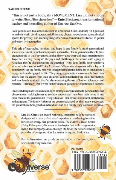 "This is not just a book, it’s a MOVEMENT. Lisa did not choose to write Hive, Hive chose her." —Kute Blackson, transformational teacher and bestselling author of You.Are.The.One. Four generations live under one roof in Columbus, Ohio, and they’ve figure out to make it work: dividing responsibilities and chores, re-designing some physical spaces for privacy, and reconfiguring others into common areas for all to gather and enjoy living together. This tale of heartache, heroism, and hope is one family’s multi generational social experiment, which encompasses kids in their teens, parents in their forties, grandparents in their seventies, and a ninety-plus year-old great-grandmother. Together, as they navigate the joys and challenges that come with aging in America, they’re also answering the question, "How does family help you thrive at home when you’re old?" An Alzheimer’s/dementia diagnosis adds a layer of complexity, yet the family resolves to keep their eldest at home for as long as she’s happy, safe and engaged in life. The younger generation learns much from their elders, and the elders from their children. While mastering the use of technology and new family systems, they’re also mastering the use of humor, tolerance, and patience. Ultimately, that’s what makes this four-generation experiment a success. Practical design advice and clear-eyed strategies are mixed with personal tips and observations, making it easy to see how anyone can transform their home in into their own multi-generational living situation. Her stories are honest, both funny and poignant. The family’s fiascos are counterbalanced by their many successes, the greatest one being that as individuals and as a family, they continue to thrive.