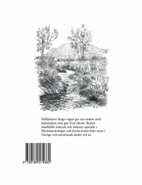 HÅLLPLATSER innehåller minnesanteckningar från resor och möten med människor och händelser som lämnat värdefulla spår i livsberättelsen. Här har jag samlat snabba blyertsteckningar där gråskalan spelar huvudrollen. Jag har velat fånga ljuset och skuggan utan att fastna i detaljerna. Teckningarna är gjorda under 2022 och 2023. Hållplatserna är från Värmland, Bohuslän, Öland, Härjedalen och Skåne. Ritblocket har också följt med till Grekland, till Kreta och Aten. Sista resan gick till Mani på södra Peloponessos, där det stora havet möter de vilda bergen. Teckningarna och minnesanteckningarna därifrån är gjorda strax innan boken trycks.