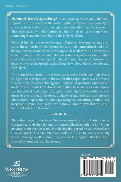 Hmmm! Who's Speaking? is an inspiring collection of first-hand reports, so to speak, that the author gathered by visiting a variety of churches from a wide array of religious denominations and backgrounds. Then he shared them first with his minister and then others so that each may learn something from other members of the body of Christ. Some of his visits were to mosques, temples, synagogues, and even cults. The author hopes his reports of visits to denominational and nondenominational churches will encourage some readers who do not attend a church, or maybe feel uncomfortable where they do go, to check out another church. He feels God has a specific church in mind for you so that you will become involved in spreading the Good News about the Father, Son, and Holy Spirit. And some of his stories in this book are about other happenings where God got his message over to the author through experiences as a Boy Scout chaplain, a Billy Graham Emergency Response chaplain, and as a chaplain for the Tulsa Juvenile Detention Center. Then there are stories about ways and things God used to get his attention either physically or with words or music or even animals like foxes, donkeys, frogs, birds, and even insects. The author's hope is that you, too, may recognize something similar that's happened in your life, and maybe you'll think, Hmmm! Was that the Father, Son and Holy Spirit speaking?