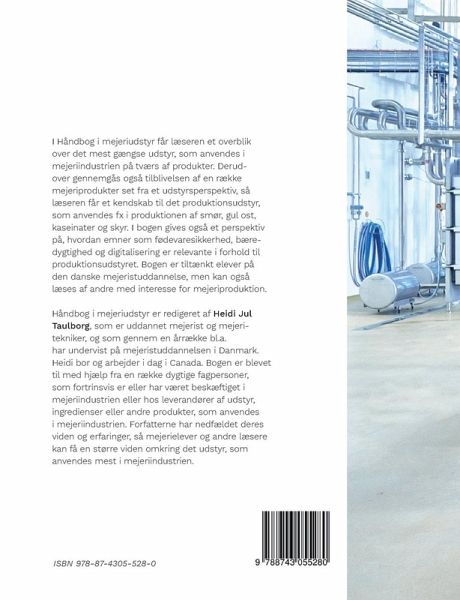 I Håndbog i mejeriudstyr får læseren et overblik over det mest gængse udstyr, som anvendes i mejeriindustrien på tværs af produkter. Derudover gennemgås også tilblivelsen af en række mejeriprodukter set fra et udstyrsperspektiv, så læseren får et kendskab til det produktionsudstyr, som anvendes fx i produktionen af smør, gul ost, kaseinater og skyr. I bogen gives også et perspektiv på, hvordan emner som fødevaresikkerhed, bæredygtighed og digitalisering er relevante i forhold til produktionsudstyret. Bogen er tiltænkt elever på den danske mejeristuddannelse, men kan også læses af andre med interesse for mejeriproduktion.