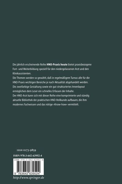 Die jährlich erscheinende Reihe HNO-Praxis heute bietet praxisbezogene Fort- und Weiterbildung speziell für den niedergelassenen Arzt und den Klinikassistenten. Die Themen werden so gewählt, daß in regelmäßigem Turnus alle für die HNO-Praxis wichtigen Bereiche je nach Aktualität abgehandelt werden. Die zweifarbige Gestaltung sowie ein gut strukturiertes Innenlayout ermöglichen dem Leser ein schnelles Erfassen der Inhalte. Der HNO-Arzt kann sich mit dieser Reihe eine komprimierte und ständig aktuelle Bibliothek der praktischen HNO-Heilkunde aufbauen, die ihm modernes Fachwissen und das nötige "Know-how" vermittelt.
