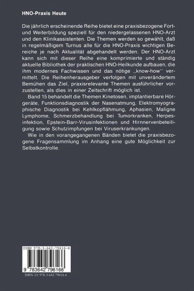 Die jährlich erscheinende Reihe bietet eine praxisbezogene Fort- und Weiterbildung speziell für den niedergelassenen HNO-Arzt und den Klinikassistenten. Die Themen werden so gewählt, daß in regelmäßigem Turnus alle für die HNO-Praxis wichtigen Bereiche je nach Aktualität abgehandelt werden. Der HNO-Arzt kann sich mit dieser Reihe eine komprimierte und ständig aktuelle Bibliothek der praktischen HNO-Heilkunde aufbauen, die ihm modernes Fachwissen und das nötige "know-how" vermittelt.