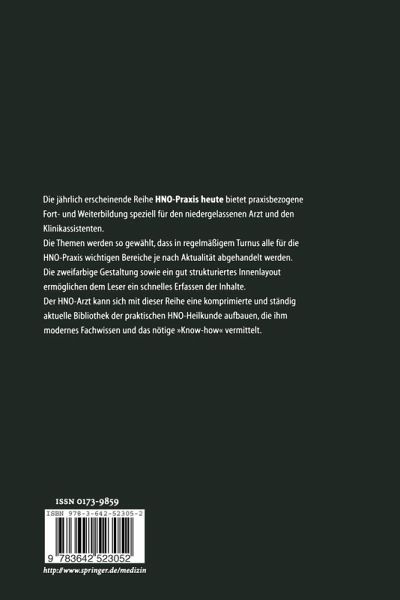 Die jährlich erscheinende Reihe HNO-Praxis heute bietet praxisbezogene Fort- und Weiterbildung speziell für den niedergelassenen Arzt und den Klinikassistenten. Die Themen werden so gewählt, daß in regelmäßigem Turnus alle für die HNO-Praxis wichtigen Bereiche je nach Aktualität abgehandelt werden. Die zweifarbige Gestaltung sowie ein gut strukturiertes Innenlayout ermöglichen dem Leser ein schnelles Erfassen der Inhalte. Der HNO-Arzt kann sich mit dieser Reihe eine komprimierte und ständig aktuelle Bibliothek der praktischen HNO-Heilkunde aufbauen, die ihm modernes Fachwissen und das nötige "Know-how" vermittelt.