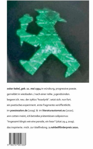 das interview. zum nahbellförderpreis. für mein debut. nach einer reihe. jugendsünden. zog ich einen strich. unter notiertes. und begann. neu. ein tausendteiliger zyklus: "hoaxlyrik - egomorphe effekte". ein poetisches experiment. ann cotten meint, ich betreibe prätentiösen solipsismus: "insgesamt klingts wie eine parodie, ein hoax" (zitat 29.4.2019). das inspirierte. mich. zur titelfindung.