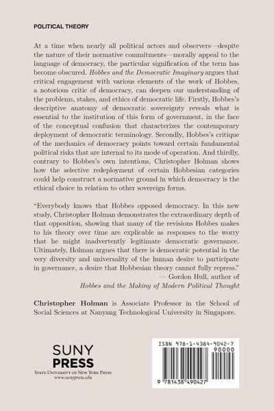 At a time when nearly all political actors and observers¿despite the nature of their normative commitments¿morally appeal to the language of democracy, the particular signification of the term has become obscured. Hobbes and the Democratic Imaginary argues that critical engagement with various elements of the work of Hobbes, a notorious critic of democracy, can deepen our understanding of the problems, stakes, and ethics of democratic life. Firstly, Hobbes's descriptive anatomy of democratic sovereignty reveals what is essential to the institution of this form of government, in the face of the conceptual confusion that characterizes the contemporary deployment of democratic terminology. Secondly, Hobbes's critique of the mechanics of democracy points toward certain fundamental political risks that are internal to its mode of operation. And thirdly, contrary to Hobbes's own intentions, Christopher Holman shows how the selective redeployment of certain Hobbesian categories could help construct a normative ground in which democracy is the ethical choice in relation to other sovereign forms.