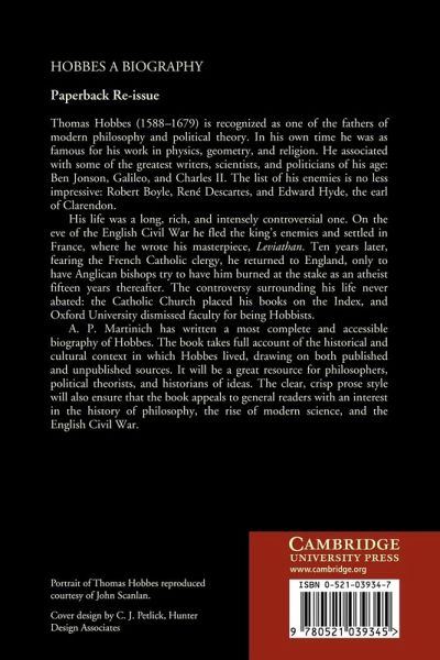 Thomas Hobbes (1588–1679) is now recognized as one of the fathers of modern philosophy and political theory. In his own time he was as famous for his work in physics, geometry, and religion. He associated with some of the greatest writers, scientists, and politicians of his age. Martinich has written the most complete and accessible biography of Hobbes available. The book takes full account of the historical and cultural context in which Hobbes lived, drawing on both published and unpublished sources. It will be a great resource for philosophers, political theorists, and historians of ideas. The clear, crisp prose style will also ensure that the book appeals to general readers with an interest in the history of philosophy, the rise of modern science, and the English Civil War.