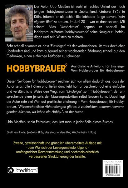 "Der Autor Udo Meeßen ist wohl ein echtes Unikat der noch jungen Hobbybrauerszene in Deutschland. Geboren 1962 in Köln, träumte er als echter Bierliebhaber lange davon, "sein eigenes Bier" zu brauen. Im Juni 2011 war es dann so weit. Mit seinem Alias "TrashHunter" begann er speziell im Hobbybrauer-Forum "hobbybrauer.de" seine Neugier zu befriedigen und sein Wissen zu mehren. Sehr schnell erkannte er, dass "Einsteiger" mit der vorhandenen Literatur doch eher überfordert sind und kam aufgrund seiner wachsenden Erfahrung schnell auf den Gedanken, einen einfachen Leitfaden zu schreiben.Dieser "Leitfaden für Hobbybrauer" zeichnet sich vor allem dadurch aus, dass der Autor selbst alle Höhen und Tiefen durchlebt hat.Er beschreibt auf eine einfache und verständliche Weise den Weg, vom "Einsteiger" zum "Hobbybrauer", der ansprechende Biere jenseits der Massenproduktion selbst brauen kann.Dabei legt der Autor sehr viel Wert auf praktische Erfahrung - Vom Hobbybrauer, für Hobbybrauer. "Wissenschaftliche Abhandlungen gibt es in zahlreichen anderen hervorragenden Büchern, wir leben ein Hobby.", so der Autor.Udo Meeßen ist ein Enthusiast, das liest man in jeder Zeile dieses Buches."Zitat Hans Holle, (Zebulon Bräu, das etwas andere Bier, Wachenheim / Pfalz)