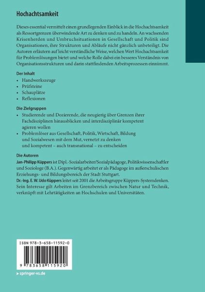 Dieses Essential vermittelt einen grundlegenden Einblick in die Hochachtsamkeit als Ressortgrenzen überwindende Art zu denken und zu handeln. An wachsenden Krisenherden und Umbruchsituationen in Gesellschaft und Politik sind Organisationen, ihre Strukturen und Abläufe nicht gänzlich unbeteiligt. Die Autoren erläutern auf leicht verständliche Weise, welchen Wert Hochachtsamkeit für Problemlösungen bietet und welche Rolle dabei ein besseres Verständnis von Organisationsstrukturen und darin stattfindenden Arbeitsprozessen einnimmt.