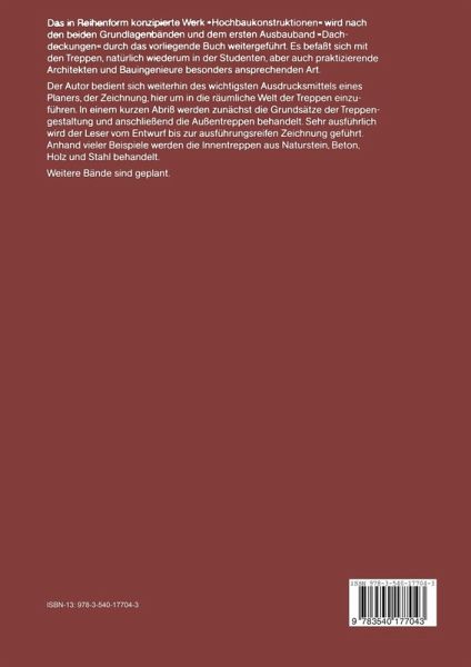 Das in Reihenform konzipierte Werk Hochbaukonstruktionen wird nach den beiden Grundlagenbänden und dem ersten Ausbauband Dachdeckungen durch das vorliegende Buch weitergeführt. Es befaßt sich mit den Treppen, natürlich wiederum in der Studenten, aber auch praktizierende Architekten und Bauingenieure besonders ansprechenden Art. Der Autor bedient sich weiterhin des wichtigsten Ausdruckmittels eines Planers, der Zeichnung, hier um in die räumliche Welt der Treppen einzuführen. In einem kurzen Abriß werden zunächst die Grundsätze der Treppengestaltung und anschließend die Außentreppen behandelt. Sehr ausführlich wird der Leser vom Entwurf bis zur ausführungsreifen Zeichnung geführt. Anhand vieler Beispiele werden die Innentreppen aus Naturstein, Beton, Holz und Stahl behandelt. Weitere Bände sind geplant.