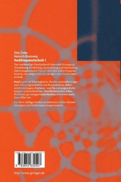 Band 1 geht auf Schwingkreise, Hochfrequenzübertrager und -filter, Eigenschaften von Koaxialkabeln, Mikrostreifenleitungen, Koplanar- und Fin-Leitungen, Richtkoppler, Lichtwellenleiter, Oberflächenwellen-Filter, Hohlleiter, gyromagnetische Medien, Antennen sowie Quarzfilter ein. Für die 6. Auflage wurden an mehreren Stellen Aktualisierungen und Änderungen vorgenommen.'