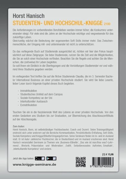 Die Anforderungen im vorbereitenden Berufsleben werden immer höher, die Konkurrenz untereinander steigt. Für viele sind die Jahre an der Hochschule wichtige und wegweisende für das zukünftige Leben. Gleichzeitig wächst die Bedeutung der sogenannten Soft Skills immer mehr. Das Zwischenmenschliche, der Umgang mit- und untereinander ist nicht zu unterschätzen. Da das vorliegende Buch auf Studierende ausgerichtet ist, richten wir hier den Fokus hauptsächlich auf diese Zielgruppe. Sie liebe Studierende, nutzen Sie die Zeit und die Möglichkeiten, die Sie an solch einer Hochschule vorfinden. Beachten Sie die Regeln und achten Sie die Menschen, die (zeitweise) Ihr Leben begleiten.So soll Ihnen ein Einblick in die Überlegungen und die Vorstellungen Studierender vor und während ihres Studiums gegeben werden.Im vorliegenden Text treffen Sie auf die fiktive Studierende Claudia, die im 3. Semester Bachelor International Business an einer privaten Hochschule studiert. Sie wird Sie liebe Leserin, lieber Leser durch folgende Kapitel dieses Buch begleiten.-Immatrikulation-Studentisches Umfeld auf dem Campus-Soziale Kompetenz an der Uni-Interkultureller Austausch-ExmatrikulationTauchen Sie ein in die faszinierende Welt des Lebens an einer privaten Hochschule. Von den ersten Gedanken ans Studium bis zur Graduation, zur Überreichung des Abschlusszertifikats auf der Abschlussgala.
