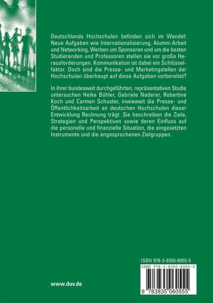 Heike Bühler, Gabriele Naderer, Robertine Koch und Carmen Schuster untersuchen, inwieweit die Presse- und Öffentlichkeitsarbeit an deutschen Hochschulen deren neuen Aufgaben wie Internationalisierung, Alumni-Arbeit und Networking, Werben um Sponsoren und um die besten Studierenden und Professoren Rechnung trägt. Dies wird analysiert im Kontext der personellen und finanziellen Situation sowie in Abhängigkeit von der strategischen Ausrichtung.