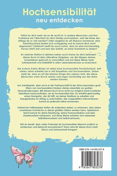 Gehörst du zu den Menschen, die einfach mehr empfinden als andere? Hochsensible besitzen ein tiefes Verständnis für zwischenmenschliche Zusammenhänge. Das bringt viele Herausforderungen im Leben mit sich: * "Du bist viel zu sensibel!" - wer diesen schnell dahin gesagten Satz öfter hört, kommt automatisch ins Grübeln. Scham und das Gefühl, dass irgendetwas nicht in Ordnung ist mit der eigenen Persönlichkeit, sind die Folgen. * Schnelle Müdigkeit, der Drang alleine zu sein und die Tendenz, sich den ganzen Tag ins Bett zu flüchten - wer nur auf diese Weise wieder seine Akkus aufladen kann, zählt zu der Gruppe der hochsensiblen Menschen. * Hochsensible sind ein Magnet für die Probleme ihrer Mitmenschen. Viele kommen gerne und suchen Rat und ein offenes Ohr. Gleichzeitig können Hochsensible nicht guter Stimmung sein, wenn Ihr Gegenüber schlecht drauf ist. Trauer, Schmerz und Wut, die andere empfinden, sind für hochsensible Menschen oft unerträglich. * Ein feines Gespür für Musik und Kunst - das ist ebenfalls typisch für hochsensible Persönlichkeiten. Sie nehmen Abstand von Filmen mit zu viel Action und Gewalt. Das Leiden in der Welt bewegt sie stark. Daher gestalten sie ihr Leben gerne so, dass sie mit überfordernden Situationen möglichst wenig konfrontiert werden. Wenn du dich in einem oder mehreren Punkten erkennst, ist das kein Grund zur Sorge. Hochsensibilität ist keine Krankheit. Ganz im Gegenteil. Wenn du dich auf die Reise begibst, um dein Innenleben besser zu verstehen, wirst du erkennen, dass du ein echtes Geschenk erhalten hast. Denn richtig genutzt, wird dein Leben durch die Hochsensibilität bunter, erfüllter und facettenreicher. Das weiß niemand besser als Katrin Winter. Die psychologische Beraterin ist selbst hochsensibel und hilft Menschen dabei, die ganz persönliche Gabe als Wunder zu betrachten und so einzusetzen, dass alle Lebensbereiche optimiert werden. Wenn du dich nicht mehr ausgebrannt fühlen willst und deine Energie in schöne Aktivitäten lenken willst, dann ist dieser Ratgeber dein unverzichtbarer Leitfaden. Darum geht es in dem Buch: * Bist du überhaupt hochsensibel? Anhand von vielen Fallbeispielen sowie einem fundierten Selbsttest bist du direkt in der Lage, zu erkennen, ob du hochsensibel bist! * Das Leben als hochsensibler Mensch: Wie sich Hochsensibilität sich in den verschiedenen Lebensphasen zeigt. Die Autorin weist außerdem auf spezielle Herausforderungen hin und bietet praxiserprobte Lösungsmöglichkeiten an. Ob hochsensible Babys, Kinder, Teenager, junge Erwachsene oder im reifen Alter - mit diesem Kompass lassen sich die Facetten der Hochsensibilität gezielt ausloten! * Deine seelische Gesundheit: Was ein destruktives Umfeld kennzeichnet und welche Lebensbereiche sich negativ auf dein Seelenleben auswirken können. Erhalte wirksame Praxistipps von der Ernährung über den Schlaf bis hin zur Vermeidung von Reizüberflutung, die Körper, Geist und Seele in Einklang bringen. * Hochsensible und Partnerschaft - kenne Herausforderungen und Fallstricke! Erfahre, wie du mit Affirmationen gezielt an deinem Liebesglück arbeiten kannst! * Mit großem Praxisteil: Übungen für alle Situationen in deinem Leben, die sich mit wenig Aufwand durchführen lassen. So vermeidest du in Zukunft Stress und das Gefühl von Überforderung! Jetzt liegt es an dir: Machst du weiter wie gehabt oder stellst du deine Weichen ganz neu? Falls du als hochsensibler Mensch mehr Ruhe und Lebensqualität möchtest, führt an diesem Buch kein Weg vorbei! Sichere dir jetzt dein Exemplar!