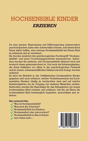 Da eine genaue Abgrenzung und Differenzierung insbesondere psychologischen Laien eher schwerfallen könnte, soll dieses Buch Ihnen dabei helfen, eine etwaige Hochsensibilität bei Ihrem Kind zu erkennen und zu verstehen. Sie werden zunächst den psychologischen Fachbegriff "Hochsensibilität" und seine Forschungsgeschichte kennenlernen. Außerdem werden Sie erfahren, wie Hochsensibilität definiert wird und wodurch diese gekennzeichnet ist. Und auch die Schwierigkeiten, die diese Definition vor allem in der psychologischen Fachwelt und im (neuro-)wissenschaftlichen Diskurs mit sich bringt, werden erläutert. Es wird ein Einblick in die Gefühlswelten hochsensibler Kinder gegeben und auch erläutert, welche Verhaltensweisen bei hochsensiblen Kindern häufig zu beobachten sind und auf welche Schwierigkeiten sie im Umgang mit anderen Menschen stoßen. Außerdem werden Sie Ratschläge für das Alltagsleben mit einem hochsensiblen Kind erhalten und erfahren, wie Sie als Eltern Ihr hochsensibles Kind bestmöglich begleiten, unterstützen und erziehen.Das erwartet Sie:-Was ist Hochsensibilität?-Was sind die Ursachen?-Hochsensibilität bei Kindern-Hochsensibel oder introvertiert?-Hochsensibilität in Kita & Schule-und vieles mehr ...