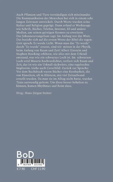 Auch Pflanzen und Tiere verständigen sich miteinander. Die Kommunikation des Menschen hat sich in einem sehr langen Zeitraum entwickelt. Durch Worte wurden seine Kultur und Religion geprägt. Dann erfand er Werkzeuge wie Schrift, Bücher, Telefon, Internet, KI und andere Medien, um seinen geistigen Kosmos zu erweitern. Das Johannesevangelium sagt: Im Anfang war das Wort. Das bezieht sich auf die ersten Worte der Bibel die sagen: Gott sprach: Es werde Licht. Wenn man das Es werde durch Es wurde ersetzt, sind wir mitten in der Physik, beim Anfang von Raum und Zeit! Albert Einstein und Stephen Hawking erklären, wie alles mit dem Urknall entstand, was wie ein schwarzes Loch ist. Im schwarzen Loch wird Materie hochverdichtet, verliert sich Raum und Zeit, das ist wie ein Urknall rückwärts, eine regelrechte Implosion. (siehe auch Coverbild) Zurück zur Sprache: Vor dem Buchdruck waren Bücher eine Kostbarkeit, die von Künstlern, oft in Klöstern, mit viel Zeitaufwand erstellt wurden. Da man sie im Alltag nicht hatte, wurden Texte auswendig gelernt. Um diese besser behalten zu können, kamen Rhythmus und Reim dazu. Dichter dieser Werke waren ebenfalls großartige Künstler, selbst aus der Antike sind sie uns noch bekannt. Sie verdichteten Sprache und schufen zeitlose Werte. Dazu prägten große Bibliotheken wie in Alexandria das Bewusstsein der Menschheit. Hier wurde das gesamte Wissen der damaligen Zeit gesammelt und verdichtet. Unsere hoch-verdichteten Texte möchten Sie gern zum Nachdenken, vielleicht auch zum Wider-Spruch anregen. Hrsg.: Hans-Jürgen Sträter, Adlerstein