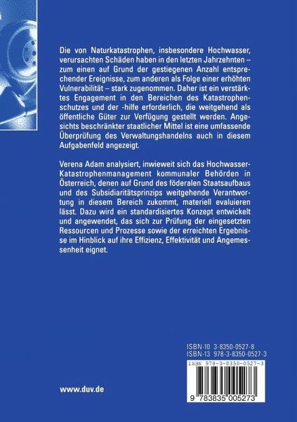 Verena Adam analysiert, inwieweit sich das Hochwasser-Katastrophenmanagement kommunaler Behörden in Österreich, denen auf Grund des föderalen Staatsaufbaus und des Subsidiaritätsprinzips weitgehende Verantwortung in diesem Bereich zukommt, materiell evaluieren lässt. Dazu wird ein standardisiertes Konzept entwickelt und angewendet, das sich zur Prüfung der eingesetzten Ressourcen und Prozesse sowie der erreichten Ergebnisseim Hinblick auf ihre Effizienz, Effektivität und Angemessenheit eignet.