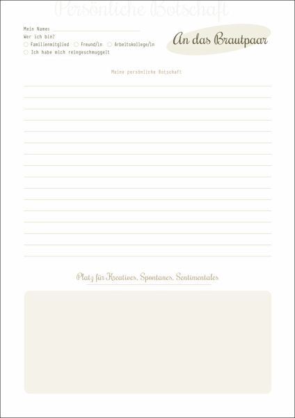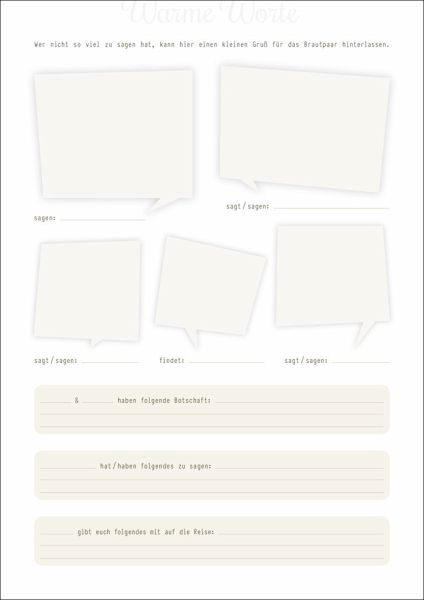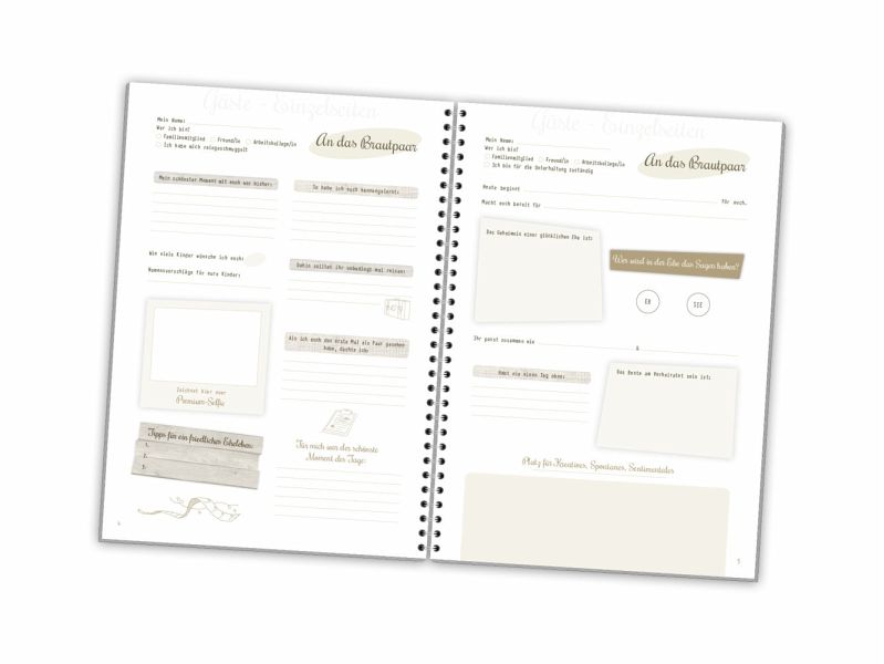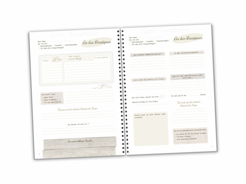 Das romantische Gästebuch im A4-Format (Umschlag etwas breiter) und mit praktischer Ringbindung enthält 6 verschiedene Seitenlayouts mit unterschiedlichen Fragen, Glückwünschen und Kommentaren an, für und über das Brautpaar. So können sich alle mit witzigen, hintergründigen und lieb gemeinten Kommentaren verewigen und dem Brautpaar ein fantastisches Erinnerungsstück an den schönsten Tag mit Ihren Lieben übergeben.Beispiele sind: Ein neunmalkluger Spruch ..., Mein schönster Moment mit euch war bisher ..., Namensvorschläge für eure Kinder..., Tipps, wie z. B. Dahin solltet ihr unbedingt mal reisen ..., Habt nie einen Tag ohne ...Auch Bekannte oder Verwandte, die nicht so viel zu sagen haben, erhalten einen würdigen Platz für Ihre kurzen Glückwünsche ;-)Dieses Gästebuch wird die Verheirateten auch später noch zum Schmunzeln anregen und die Erinnerung an die Hochzeit lebendig beiben lassen.Passend zum Hochzeitstagebuch "Ja, ich will" (ISBN: 978-3-943987-48-5) bieten wir eine Hochzeitskollektion im harmonischen Design an. Natürlichkeit und Romantik stehen hier ganz klar im Vordergrund. Das Holz-Optik-Design spricht von Harmonie und Beständigkeit, den romantischen Gegensatz bringen die "Spitzen"-Grafiken mit. So entsteht ein perfektes Zusammenspiel aus klaren Linien und liebevollen Details. Verarbeitung: Der Umschlag besteht aus stabilem, hochwertigem Offsetkarton (750g). Die Innenseiten sind auf ökologischem Papier gedruckt. Auf Wunsch drucken wir Ihren individuellen und personalisierten Text in das Gästebuch (Extrakosten). Sprechen Sie uns an!