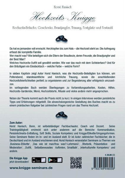 Horst Hanisch, Bonn, ist selbstständiger Fachbuchautor, Coach und Dozent. Seine Trainingstätigkeit erstreckt sich unter anderem auf die Bereiche Kommunikation, Persönlichkeits-Entfaltung, Soft Skills, Soziale Kompetenz und Knigge/Etikette/Umgangsformen. Seine Seminare finden im In- und Ausland statt. Er ist Autor zahlreicher Fachbücher, die in Deutschland und im Ausland erschienen sind. Horst Hanisch veranstaltet Seminare zu Themen wie Business-Etikette, Das wie ist man/frau was?-Lehrmenü, Rhetorik, Präsentation, Moderation, Outfit, Selbstbewusstes Auftreten, Smalltalk, Interkulturelle Kompetenz und andere.