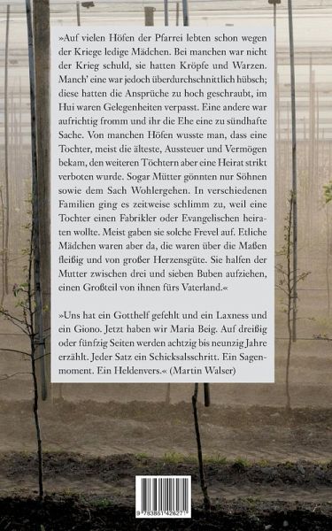 "Auf vielen Höfen der Pfarrei lebten schon wegen der Kriege ledige Mädchen. Bei manchen war nicht der Krieg schuld, sie hatten Kröpfe und Warzen. Manch eine war jedoch überdurchschnittlich hübsch; diese hatten die Ansprüche zu hoch geschraubt, im Hui waren Gelegenheiten verpasst. Eine andere war aufrichtig fromm und ihr die Ehe eine zu sündhafte Sache. Von manchen Höfen wusste man, dass eine Tochter, meist die älteste, Aussteuer und Vermögen bekam, den weiteren Töchtern aber eine Heirat strikt verboten wurde. Sogar Mütter gönnten nur Söhnen sowie dem Sach Wohlergehen. In verschiedenen Familien ging es zeitweise schlimm zu, weil eine Tochter einen Fabrikler oder Evangelischen heiraten wollte. Meist gaben sie solche Frevel auf. Etliche Mädchen waren aber da, die waren über die Maßen fleißig und von großer Herzensgüte. Sie halfen der Mutter zwischen drei und sieben Buben aufziehen, einen Großteil von ihnen fürs Vaterland."