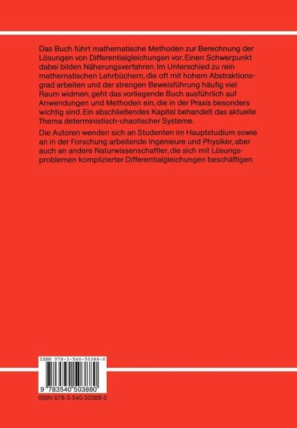 Das Buch führt mathematische Methoden zur Berechnung der Lösungen von Differentialgleichungen vor. Einen Schwerpunkt dabei bilden Näherungsverfahren. Im Unterschied zu rein mathematischen Lehrbüchern, die oft mit hohem Abstraktionsgrad arbeiten und der strengen Beweisführung häufig viel Raum widmen, geht das vorliegende Buch ausführlich auf Anwendungen und Methoden ein, die in der Praxis besonders wichtig sind. Ein abschließendes Kapitel behandelt das aktuelle Thema deterministisch-chaotischer Systeme. Die Autoren wenden sich an Studenten im Hauptstudium sowie an in der Forschung arbeitende Ingenieure und Physiker, aber auch an andere Naturwissenschaftler, die sich mit Lösungsproblemen komplizierter Differntialgleichungen beschäftigen.