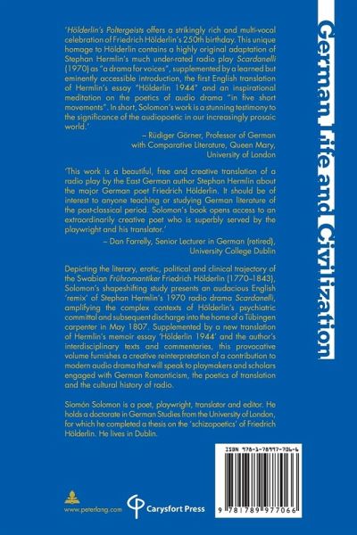 «Hölderlin's Poltergeists offers a strikingly rich and multi-vocal celebration of Friedrich Hölderlin's 250th birthday. This unique homage to Hölderlin contains a highly original adaptation of Stephan Hermlin's much under-rated radio play Scardanelli (1970) as 'a drama for voices', supplemented by a learned but eminently accessible introduction, the first English translation of Hermlin's essay 'Hölderlin 1944', as well as an inspirational meditation on the poetics of the audio drama 'in five short movements'. In short, Solomon's work is a stunning testimony to the significance of the audiopoetic in our increasingly prosaic world.» (Rüdiger Görner, Professor of German at Queen Mary, University of London)