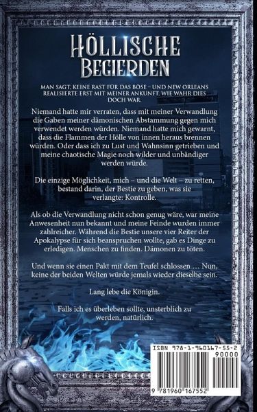 Man sagt, keine Rast für das Böse - und New Orleans realisierte erst mit meiner Ankunft, wie wahr dies doch war. Niemand hatte mir verraten, dass mit meiner Verwandlung die Gaben meiner dämonischen Abstammung gegen mich verwendet werden würden. Niemand hatte mich gewarnt, dass die Flammen der Hölle von innen heraus brennen würden. Oder dass ich zu Lust und Wahnsinn getrieben und meine chaotische Magie noch wilder und unbändiger werden würde. Die einzige Möglichkeit, mich - und die Welt - zu retten, bestand darin, der Bestie zu geben, was sie verlangte: Kontrolle. Als ob die Verwandlung nicht schon genug wäre, war meine Anwesenheit nun bekannt und meine Feinde wurden immer zahlreicher. Während die Bestie unsere vier Reiter der Apokalypse für sich beanspruchen wollte, gab es Dinge zu erledigen. Menschen zu finden. Dämonen zu töten. Und wenn sie einen Pakt mit dem Teufel schlossen ... Nun, keine der beiden Welten würde jemals wieder dieselbe sein. Lang lebe die Königin. Falls ich es überleben sollte, unsterblich zu werden, natürlich.