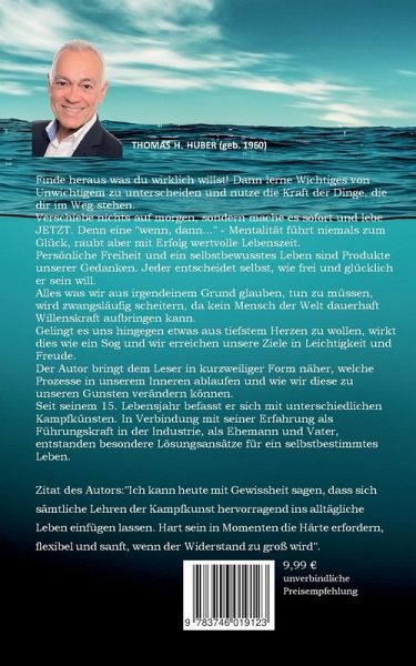 Finde heraus was du wirklich willst! Dann lerne Wichtiges von Unwichtigem zu unterscheiden und nutze die Kraft der Dinge, die dir im Weg stehen.Verschiebe nichts auf morgen, sondern mache es sofort und lebe JETZT. Denn eine "wenn, dann..." - Mentalität führt niemals zum Glück, raubt aber mit Erfolg wertvolle Lebenszeit.Persönliche Freiheit und ein selbstbewusstes Leben sind Produkte unserer Gedanken. Jeder entscheidet selbst, wie frei und glücklich er sein will. Alles was wir aus irgendeinem Grund glauben, tun zu müssen, wird zwangsläufig scheitern, da kein Mensch der Welt dauerhaft Willenskraft aufbringen kann. Gelingt es uns hingegen etwas aus tiefstem Herzen zu wollen, wirkt dies wie ein Sog und wir erreichen unsere Ziele in Leichtigkeit und Freude.Der Autor bringt dem Leser in kurzweiliger Form näher, welche Prozesse in unserem Inneren ablaufen und wie wir diese zu unseren Gunsten verändern können. Seit seinem 15. Lebensjahr befasst er sich mit unterschiedlichen Kampfkünsten.In Verbindung mit seiner Erfahrung als Führungskraft in der Industrie, als Ehemann und Vater, entstanden besondere Lösungsansätze für ein selbstbestimmtes Leben.Zitat des Autors:"Ich kann heute mit Gewissheit sagen, dass sich sämtliche Lehren der Kampfkunst hervorragend ins alltägliche Leben einfügen lassen. Hart sein in Momenten die Härte erfordern, flexibel und sanft, wenn der Widerstand zu groß wird".