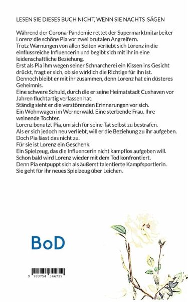Ein BeziehungsthrillerLESEN SIE DIESES BUCH NICHT, WENN SIE NACHTS SÄGENWährend der Corona-Pandemie rettet der Supermarktmitarbeiter Lorenz die schöne Pia vor zwei brutalen Angreifern.Trotz Warnungen von allen Seiten verliebt sich Lorenz in die einflussreiche Influencerin und begibt sich mit ihr in eine leidenschaftliche Beziehung.Erst als Pia ihm wegen seiner Schnarcherei ein Kissen ins Gesicht drückt, fragt er sich, ob sie wirklich die Richtige für ihn ist.Dennoch bleibt er mit ihr zusammen, denn Lorenz hat ein düsteres Geheimnis.Eine schwere Schuld, durch die er seine Heimatstadt Cuxhaven vor Jahren fluchtartig verlassen hat.Ständig sieht er die verstörenden Erinnerungen vor sich.Ein Wohnwagen im Wernerwald. Eine sterbende Frau. Ihre weinende Tochter.Lorenz benutzt Pia, um sich für seine Tat selbst zu bestrafen.Als er sich jedoch neu verliebt, will er die Beziehung zu ihr aufgeben.Doch Pia lässt das nicht zu.Für sie ist Lorenz ein Geschenk.Ein Spielzeug, das die Influencerin nicht kampflos aufgeben will.Schon bald wird Lorenz wieder mit dem Tod konfrontiert.Denn Pia entpuppt sich als äußerst talentierte Kampfsportlerin.Sie geht für ihr neues Spielzeug über Leichen.