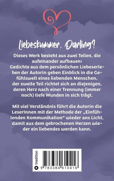 Dieses Werk besteht aus zwei Teilen, die aufeinander aufbauen: Gedichte aus dem persönlichen Liebeserleben der Autorin geben Einblick in die Gefühlswelt eines liebenden Menschen, der zweite Teil richtet sich an diejenigen, deren Herz nach einer Trennung (immer noch) tiefe Wunden in sich trägt. Mit viel Verständnis führt die Autorin die LeserInnen mit der Methode der "Einfühlenden Kommunikation" wieder ans Licht, damit aus dem gebrochenen Herzen wieder ein liebendes werden kann.